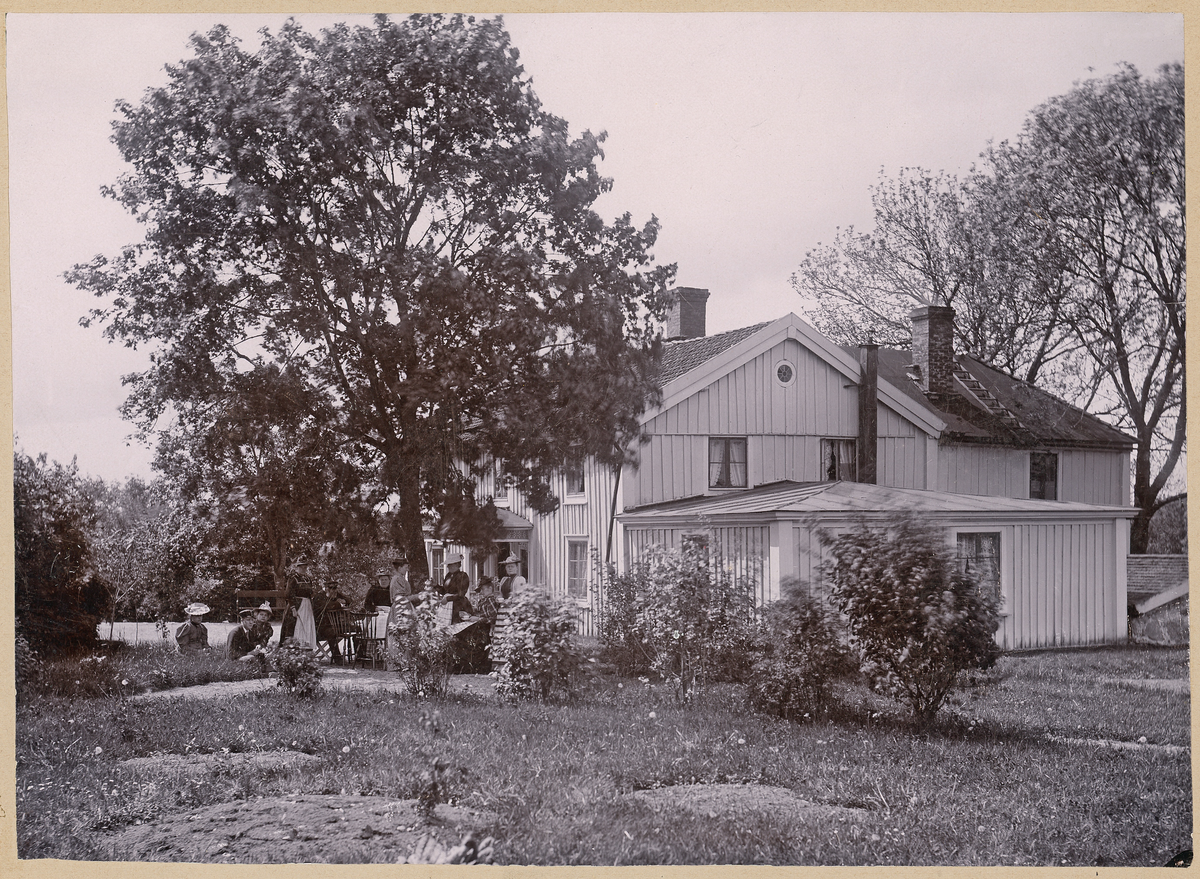 Kronolänsman J.M.W. Eksandh med familj och vänner har samlats för kaffe under vårdträdet på gårdsplanen.