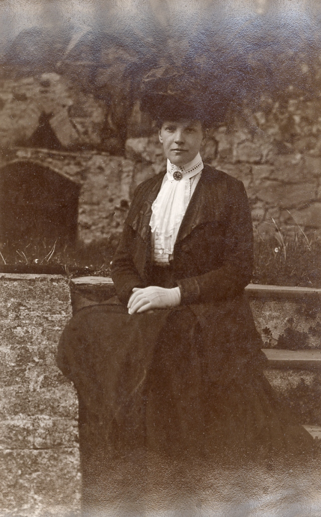En kvinna i hatt och höghalsad mörk dräkt med fischy sitter på en parkbänk. Bad Kissingen (?).
