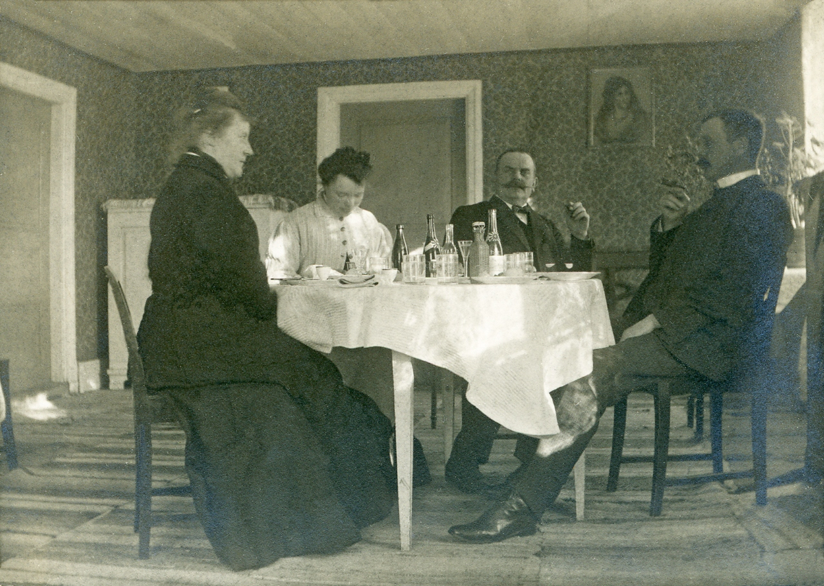 Fru Elisabeth Bergstedt sitter tillsammans med fru Mathilda Rehnström, stadsfiskal Filip Rehnström och maken, kronolänsman Albert Bergstedt,
