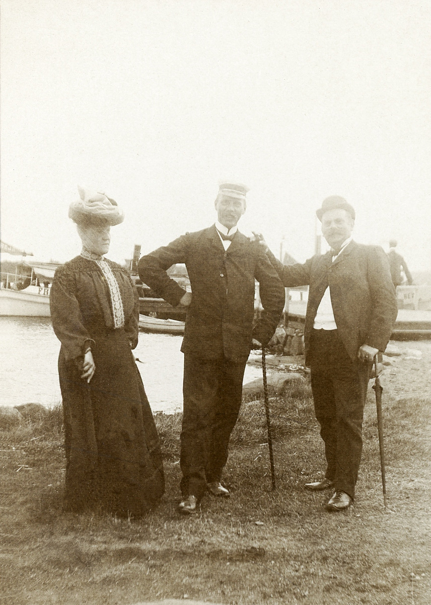Fru Elisabeth Bergstedt, hennes make kronolänsman Albert Bergstedt och deras vän, stadsfiskal Filip Rehnström, Växjö, poserar vid en