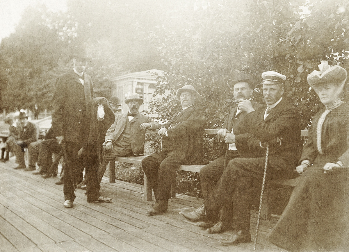 Ett antal brunnsgäster, däribland stadsfiskal Filip Rehnström med vännerna Albert och Elisabeth Bergstedt (t.h.) har samlats på ångbåtsbryggan