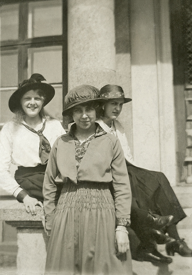 Tre tonårsflickor utanför stora entrén till landshövdingens residens i Växjö.