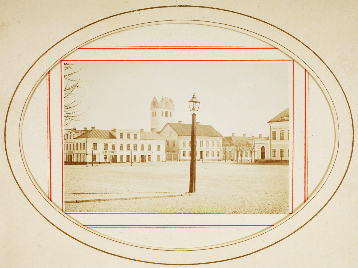 Vy över stortorget, Växjö, mot kvarteret Lejonet längs Kronobergsgatan, med bl a rådman J.E. Berghs affär. Till höger syns en del av dåv. stadshuset (senare stadshotellet). I bakgrunden ser man domkyrkotornet.