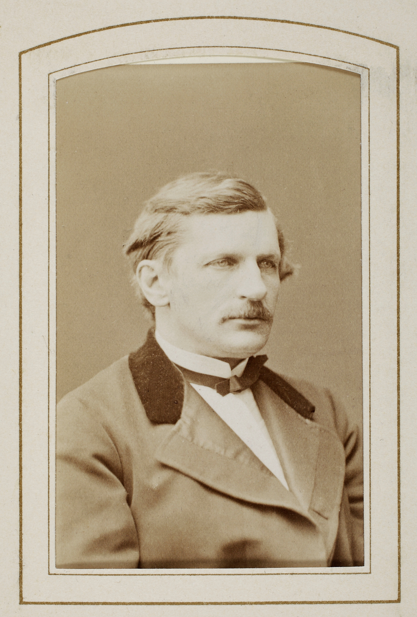 En man i redingot med sammetskrage, stärkkrage och fluga.