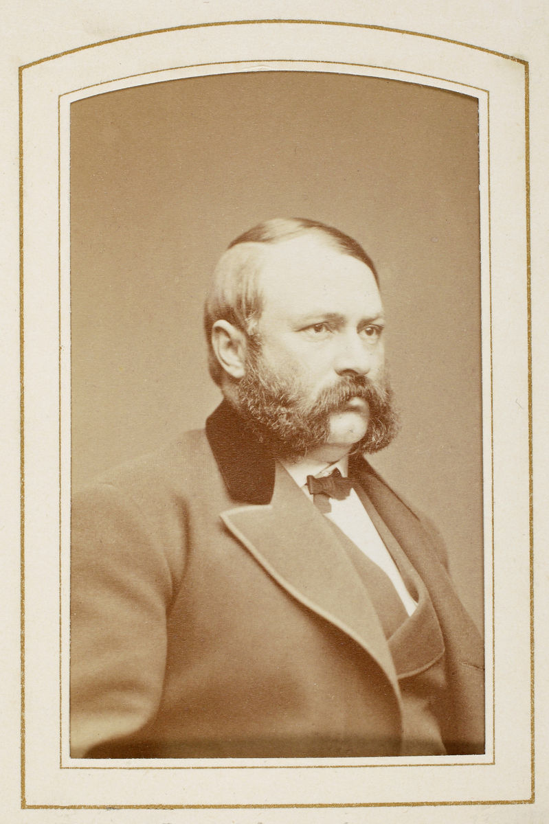 En skäggig man i redingot med sammetskrage, väst och stärkkrage med fluga.