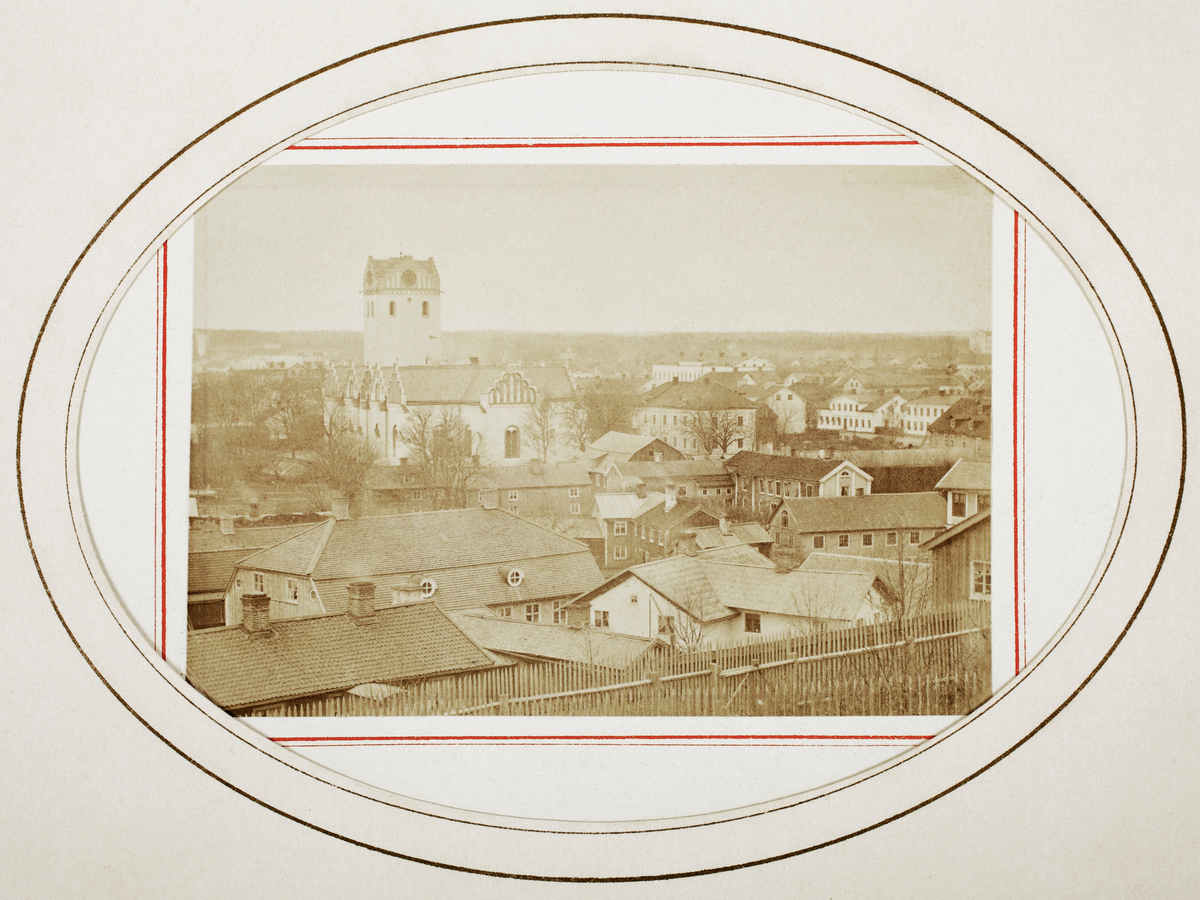 Vy från Staglaberget västerut, mot Växjö centrum. Över hustaken ser man t ex den s.k. Björklundska gården, Boismanska gården, domkyrkan med dåv. kyrkparken,, Karolinerhuset och residenset. Till höger skymtar man också fängelset.