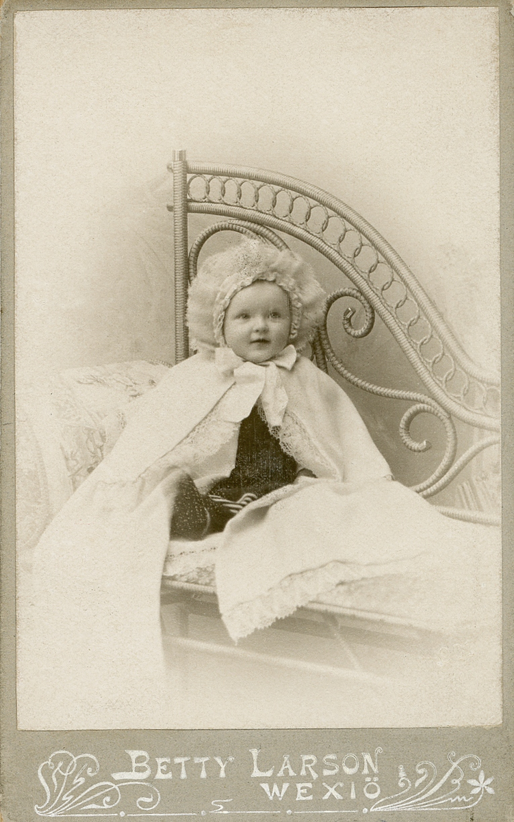 En liten flicka i spetsprydd cape och dito hätta m.m., sitter på en liten soffa hos fotografen.