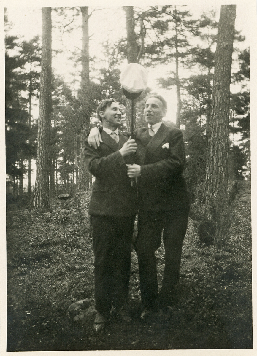 Två glada studenter i en skogsbacke, med en studentmössa på en käpp.