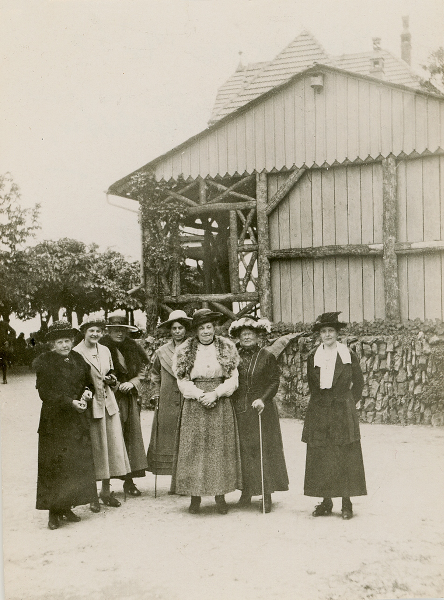 Fotot finns i original och kopia. På originalets (mörkt, vykort) baksida står: "Mormor och mamma t.v., moster Elsa. Längst t.h. Gugge Hähnel, (mamma i centrum)".