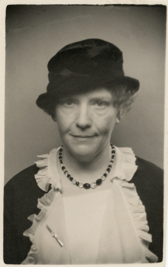 En äldre kvinna i ryschblus och mörk sammetshatt m.m.