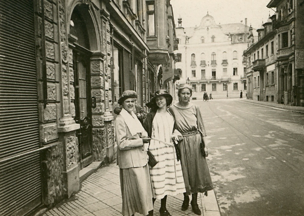 Paris (?), 1920. Tre unga kvinnor på en stadsgata.