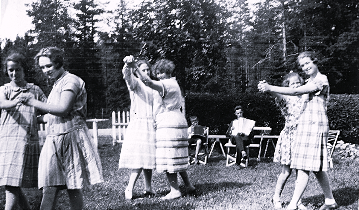 Titel: Foto av kvinnor som dansar och en man samt pojke spelar dragspel. Bildtext i album: "och dansen går..".