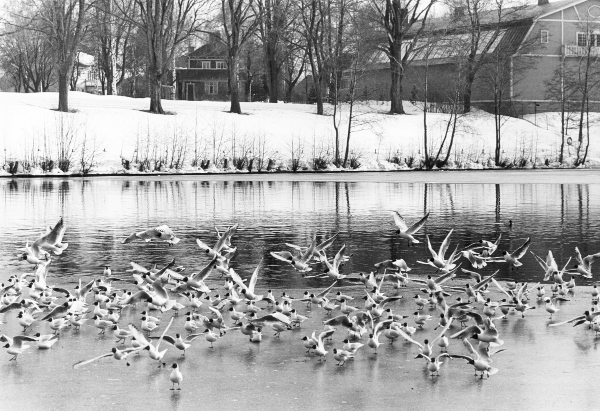 Fiskmåsar i Gavleån. Från utställningen "Gävlar i stan" på Gävle Museum 1967.