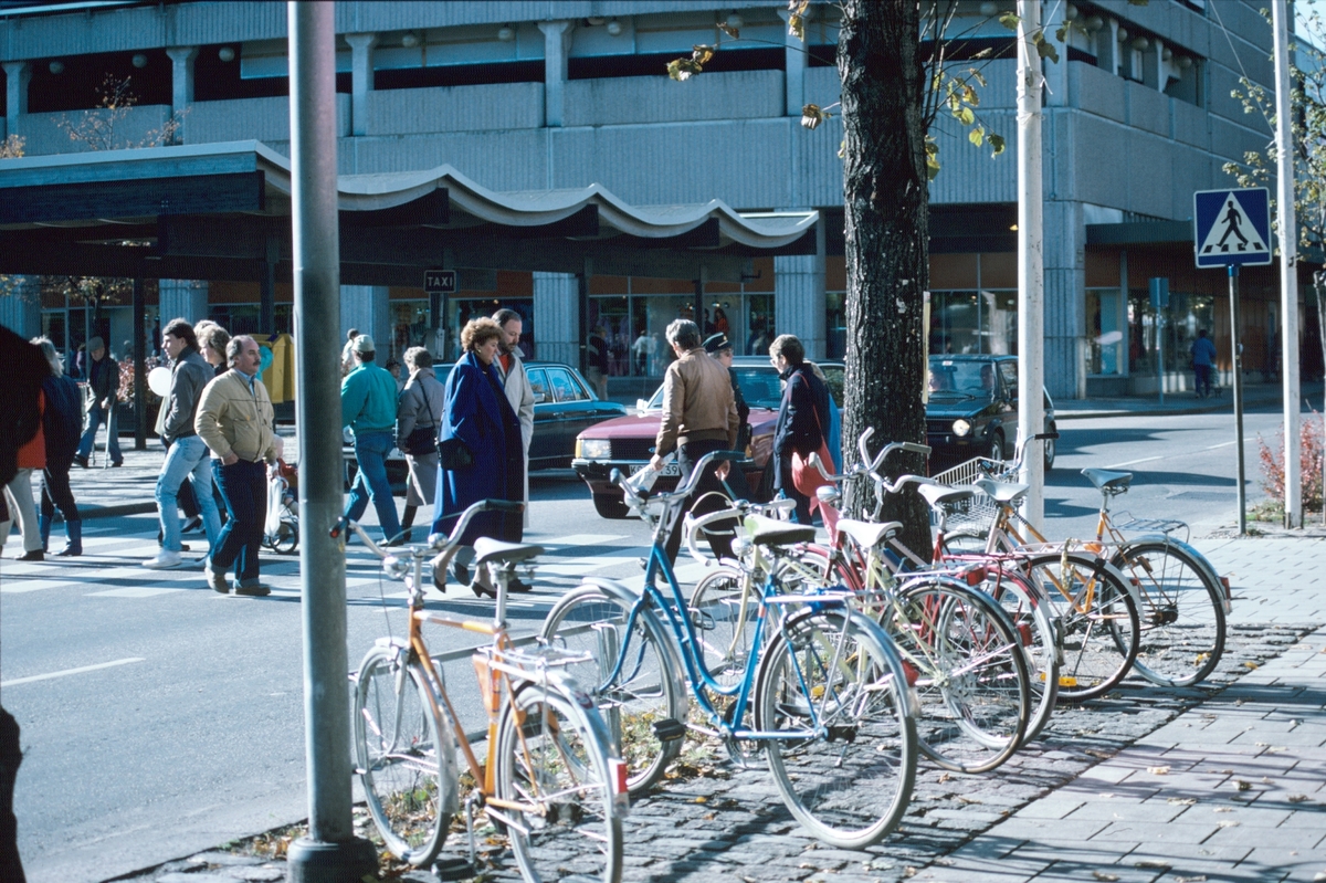 Övergångstället på Nygatan och cyklar i cykelställ.