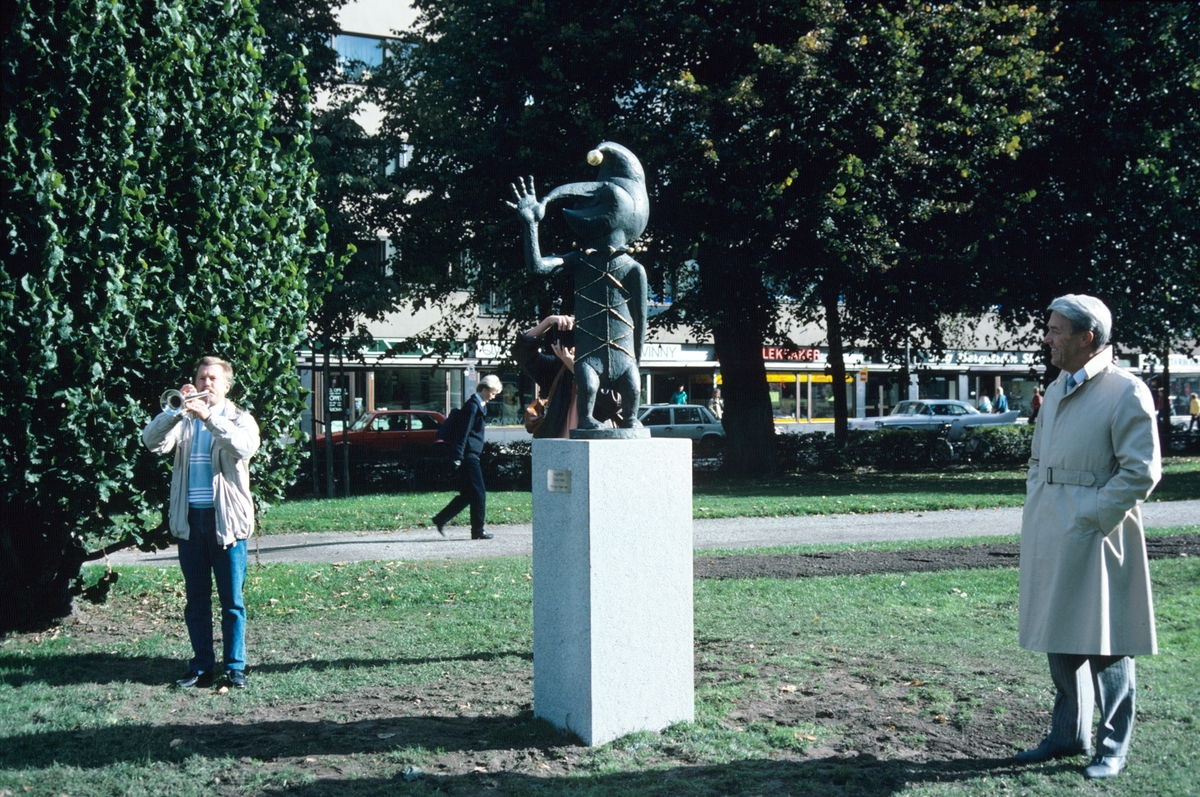 Åke Gillström invigning av staty Kasper, av Göran Strååt, i Rådhusesplanaden, Nygatan, Gävle. Staty Kasper blev senare flyttad till nuvarande plats i Rådhusesplanaden mot teatern, Staketgatan.