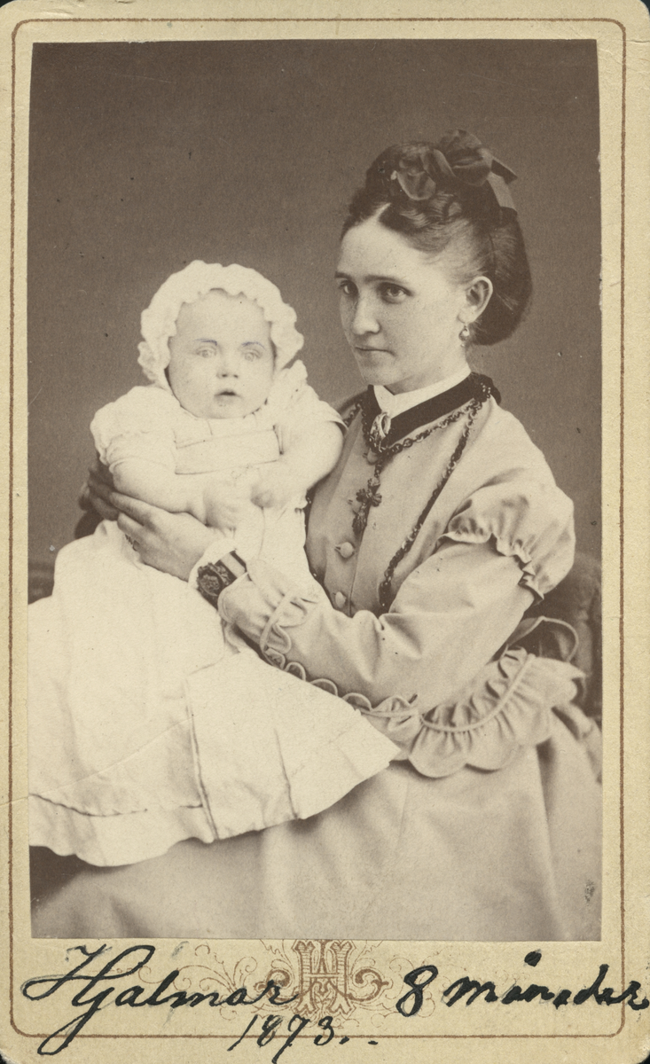 Porträtt av mor och barn. Hjalmar 8 månader 1873 (enligt text framsida kort).