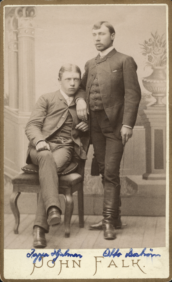 Porträtt av två män. Fr v. pappa Hjalmar och Otto Boström (enligt text framsida kort).
