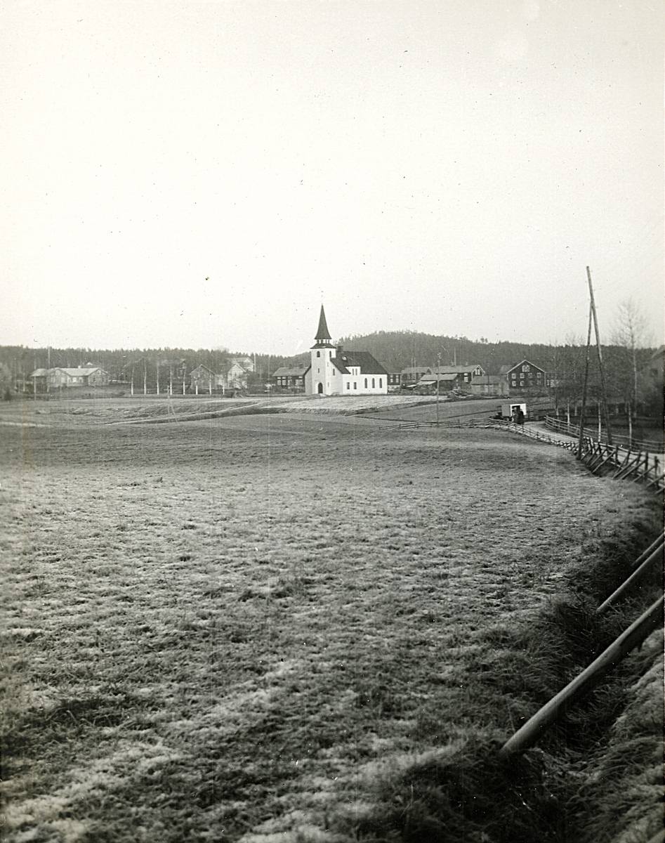 Bilden visar ett öppet landskap med Växbo kapell i bakgrunden som hör till Bollnäs församling.