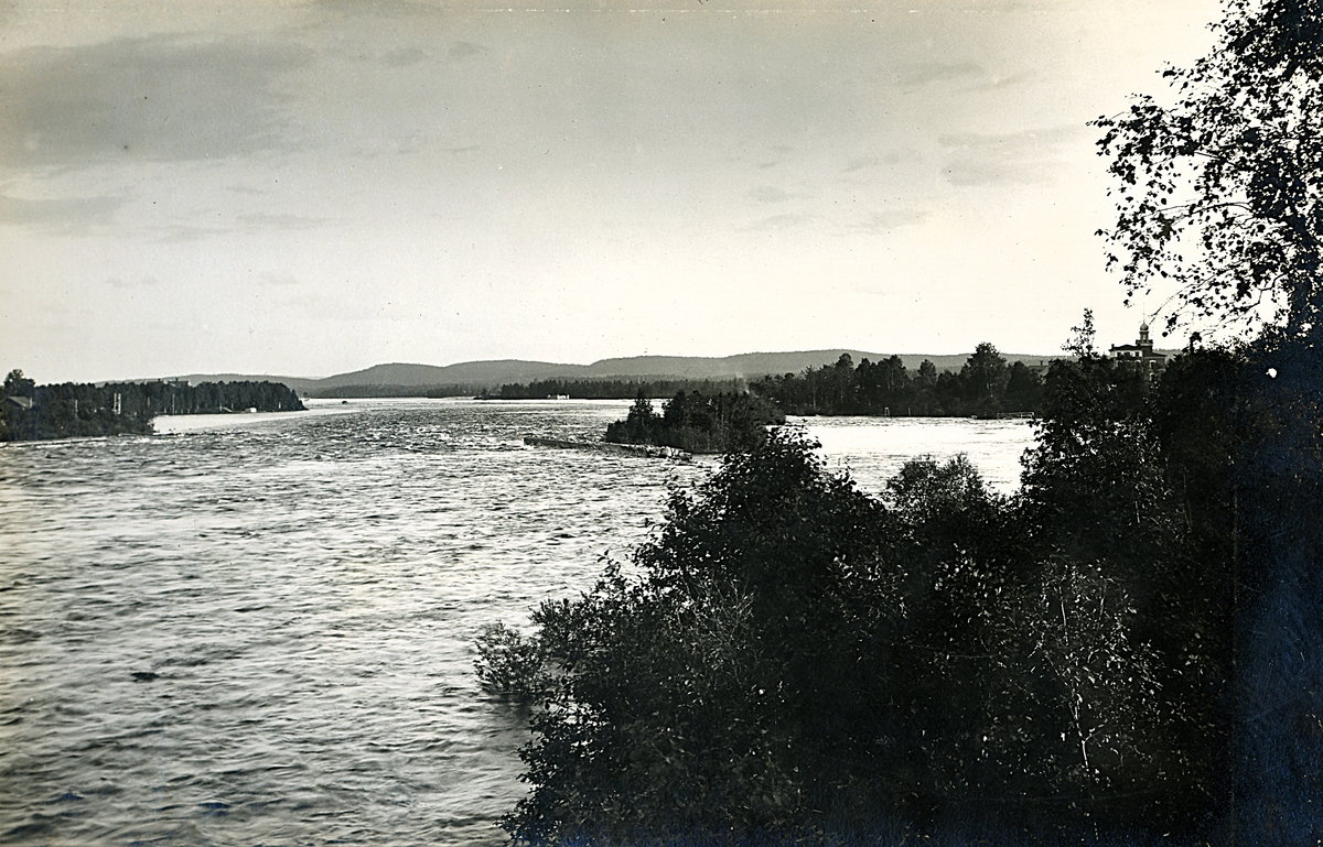 Ett älvlandskap någonstans i Hälsingland med vegetation i förgrunden.