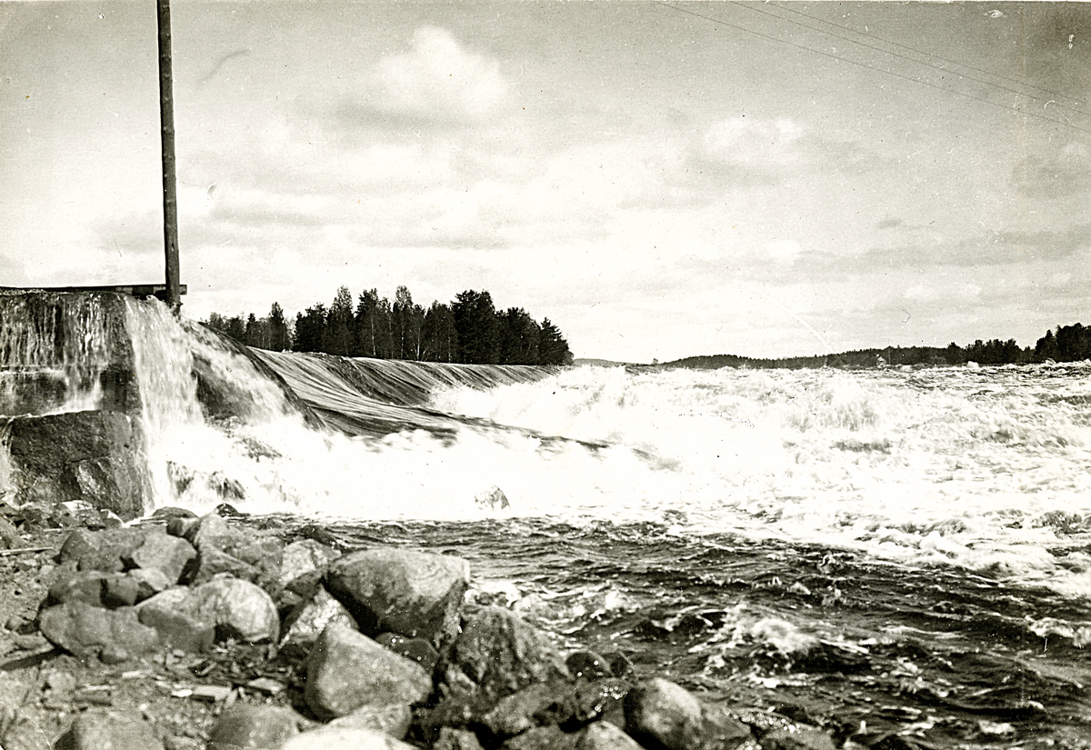 En forsande älv någonstans i Hälsingland med en stenig strandlinje i förgrunden.