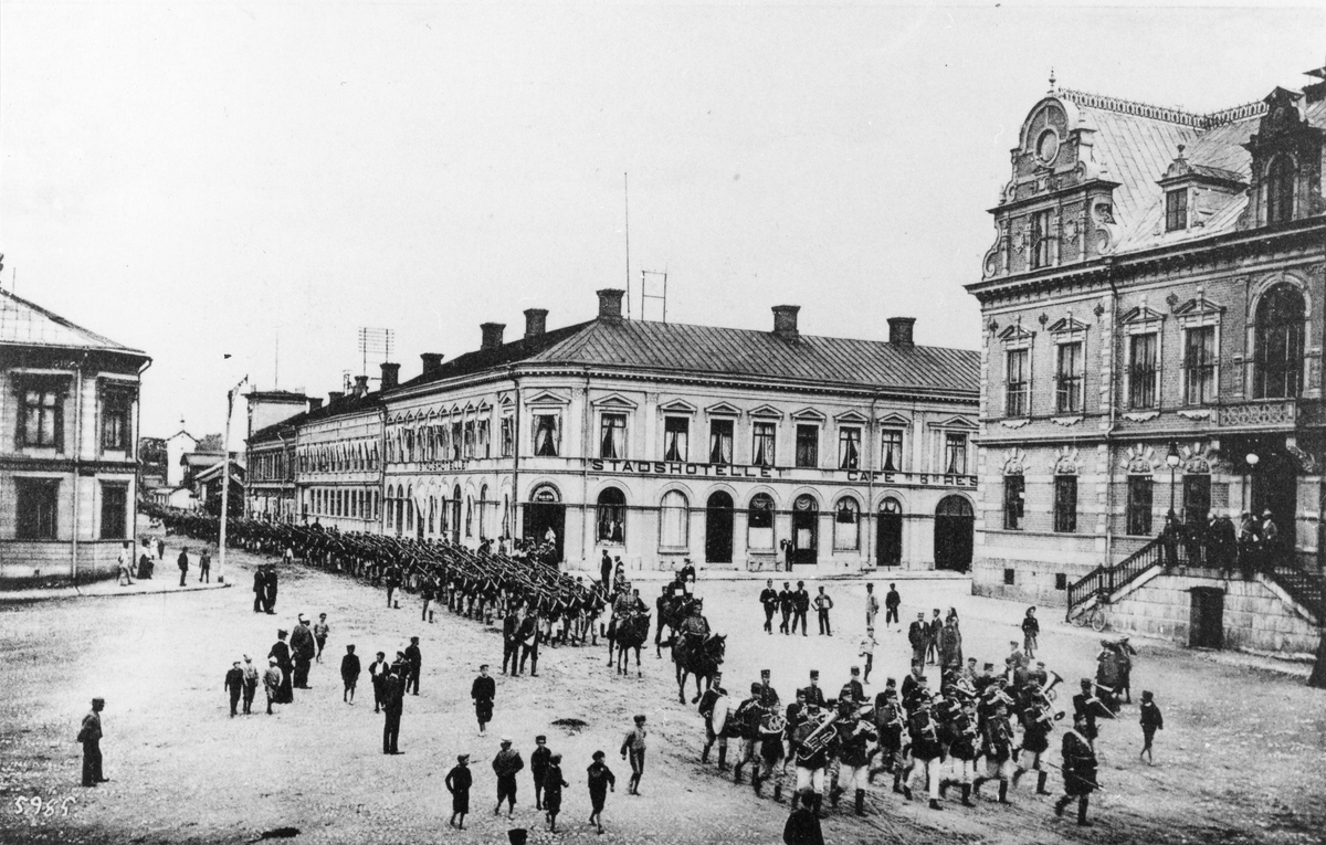 Helsinge Regemente på Fältmarsch över Rådhustorget, Söderhamn. Foto omkring år 1900.