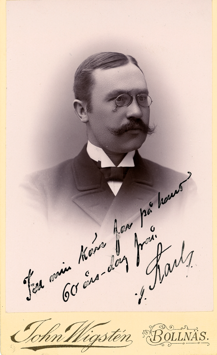 Mansporträtt. Text framsida kort: "Till min käre far på hans 60-årsdag från Karl".