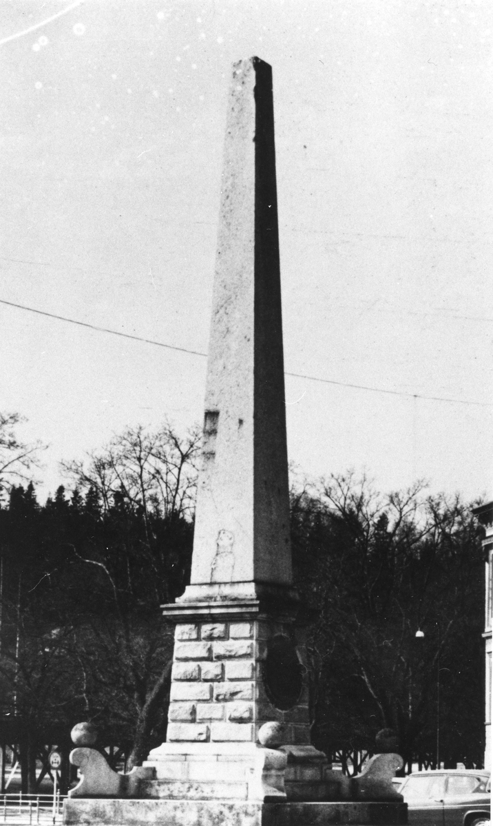 Obelisk på Rådhustorget, Söderhamn, uppsatt 1899 till minne över stadens grundläggare Gustav II Adolf. Foto från 1963.