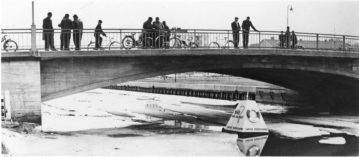 Hamnbron, en bro över Söderhamnsån vid järnvägsstationen i Norralagatans förlägning. Foto våren 1960.