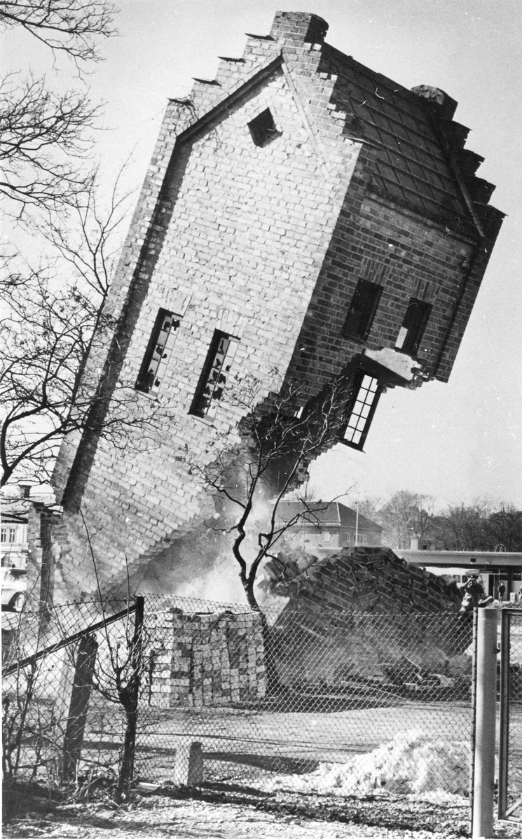 Rivning av transformatorhus mellan järnvägen och södra Hamngatan i Söderhamn. Fotot fångar ögonblicket huset faller, togs omkring 1960.