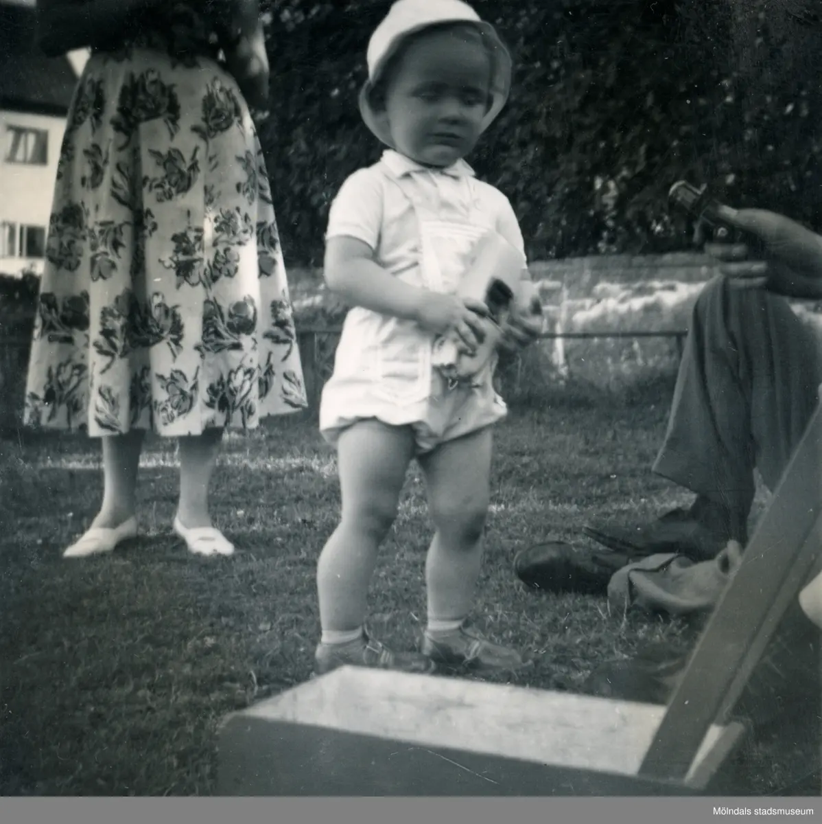 Porträtt av pojken Lennart Berndtsson i en trädgård. Prytzgatan i Broslätt, Mölndal, cirka 1955.