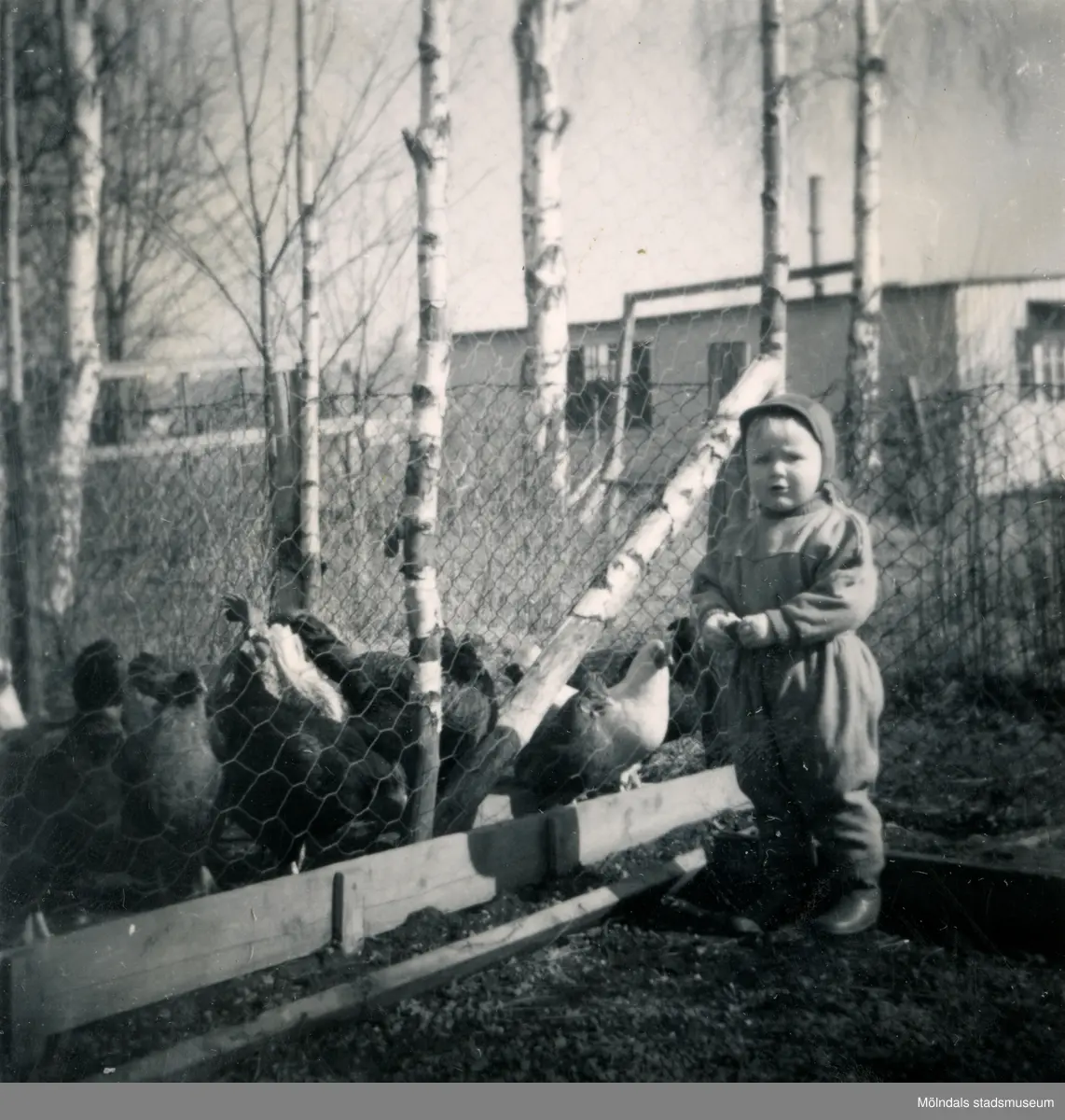 Pojken Lennart Berndtsson står intill en inhägnad med hönor. Solhemsgatan 35 på Solängen i Mölndal, cirka 1955.