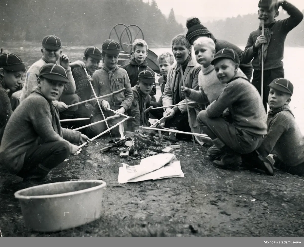 Scoutgruppen "Vargungarna" grillar vid en lägereld under en utflykt till Olofstorp, cirka 1962. Lennart Berndtsson ses i mitten.