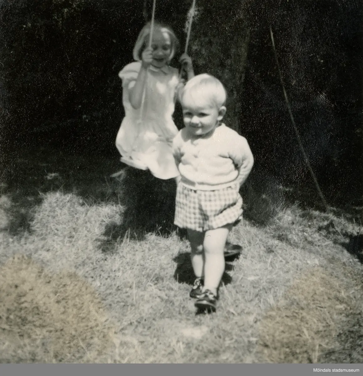 Porträtt av pojken Lennart Berndtsson och en flicka, cirka 1955. Flickan sitter på en gunga som hänger från ett träd. Fotografi eventuellt taget i Lödöse.