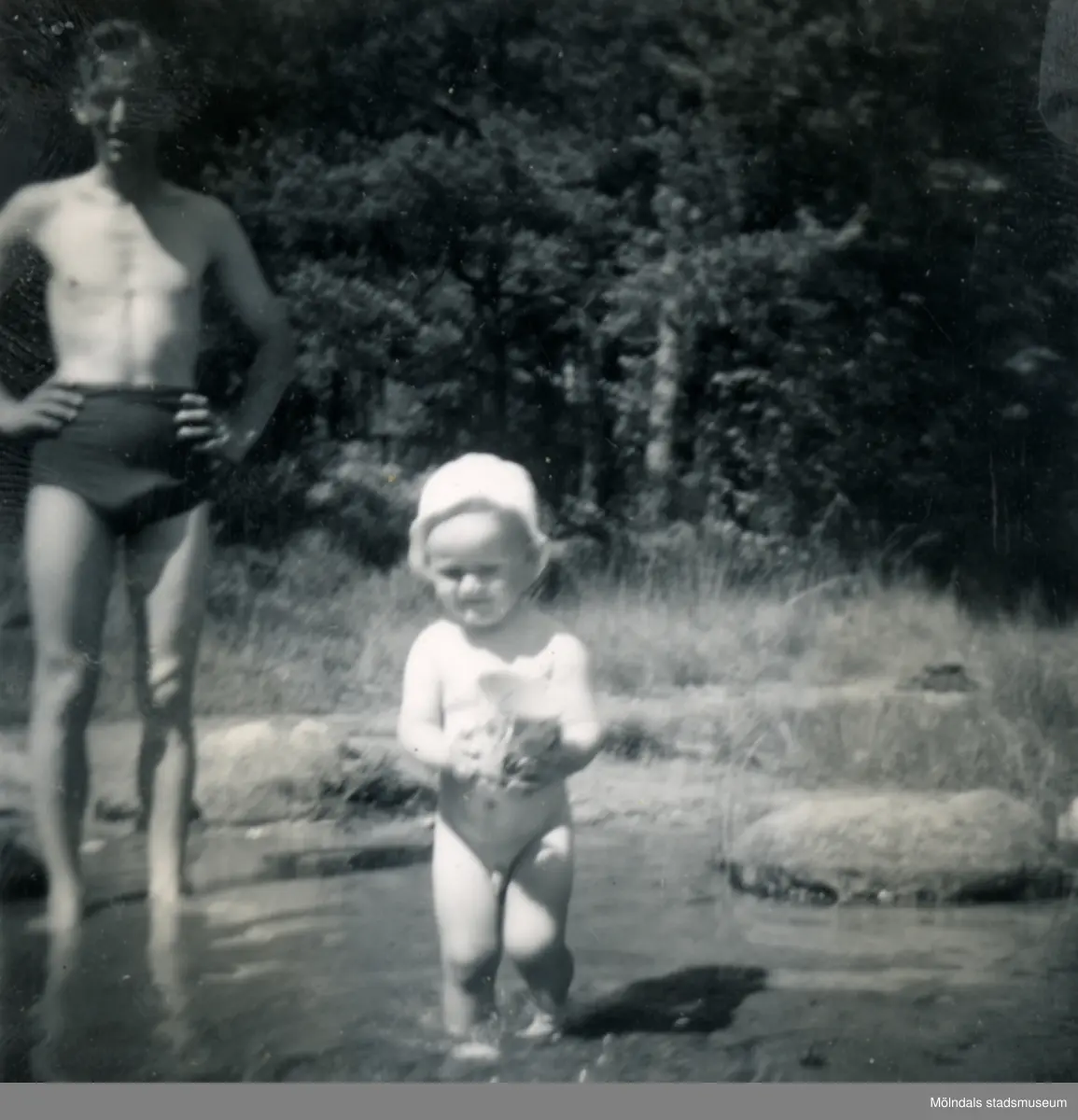 Leif Berndtsson med sonen Lennart Berndtsson står i vattnet vid badplatsen "Pisseviken" i Sisjön, Mölndal, cirka 1955.