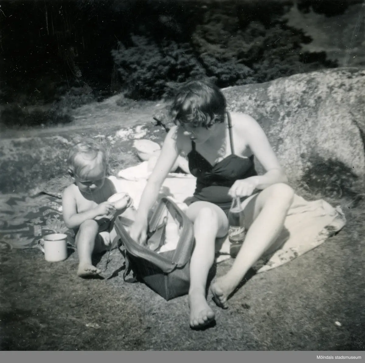 Pojken Lennart Berndtsson och hans mor Inga Maj Berndtsson sitter i gräset vid badplatsen "Pisseviken" i Sisjön, Mölndal, cirka 1955.