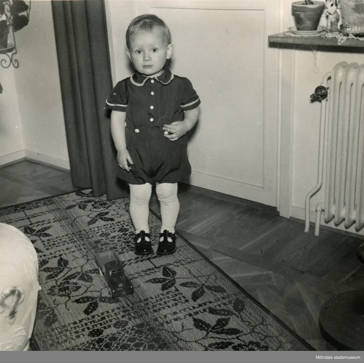 Porträtt av pojken Lennart Berndtsson med finkläderna på i ett vardagsrum. Tolsegårdsgatan 4 i Bosgården, Mölndal, hösten 1955. Familjen flyttade till adressen år 1954.