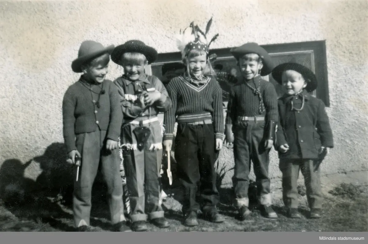 Kompisar vid Prytzgatan 38 i Broslätt, Mölndal, cirka 1957. Porträtt av en samling flickor och pojkar klädda som indianer och cowboys. Lennart Berndtsson längst till höger.