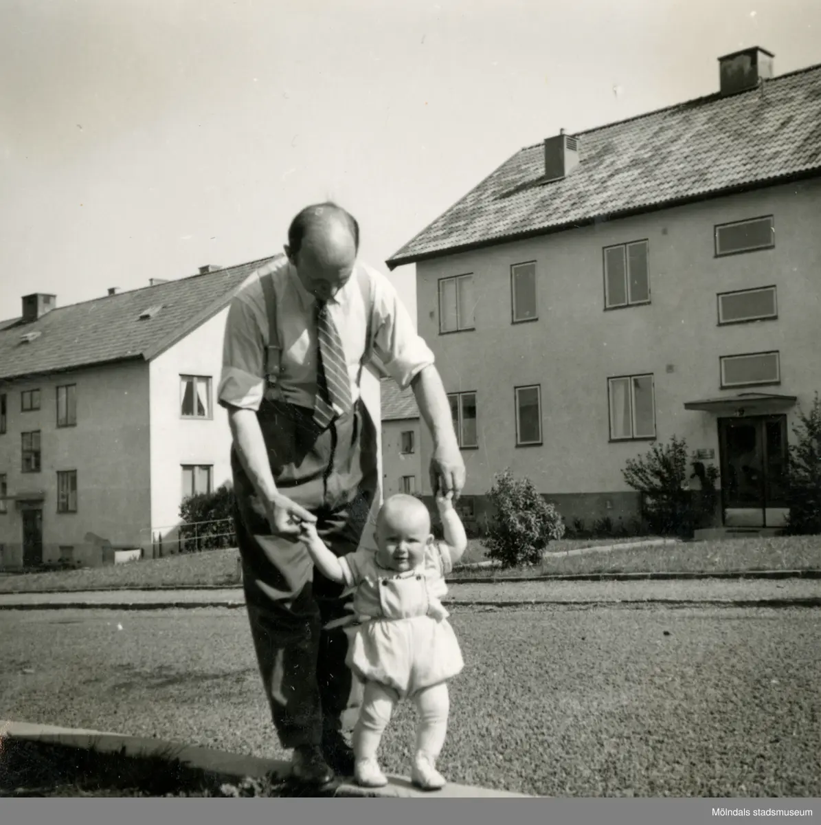 Farfar Bertil Berndtsson hjälper barnbarnet Lennart Berndtsson att gå. Bostadshus i bakgrunden. Prytzgatan i Broslätt, Mölndal, år 1954.