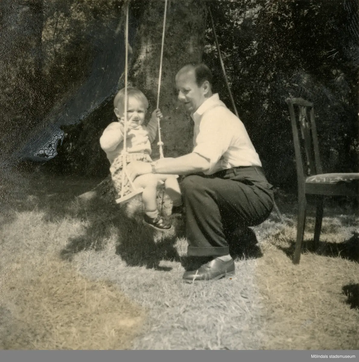 Farfar Bertil Berndtsson gungar pojken Lennart Berndtsson, cirka 1955. Gungan hänger från ett träd. Fotografi eventuellt taget i Lödöse.