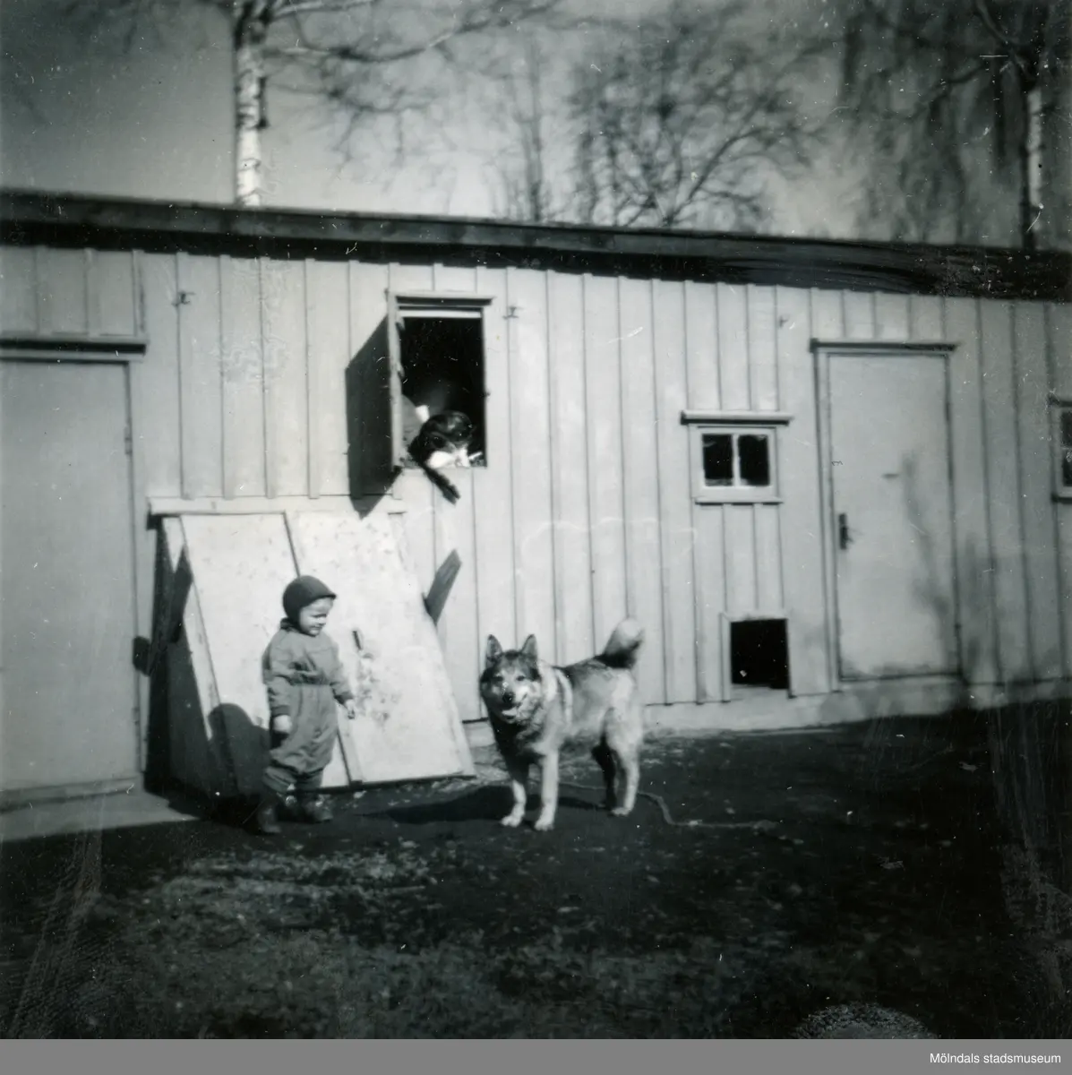 Pojken Lennart Berndtsson och en hund står på en gårdsplan intill ett uthus med "jordkällare". Utedass till höger. Solhemsgatan 35 på Solängen i Mölndal, cirka 1955.