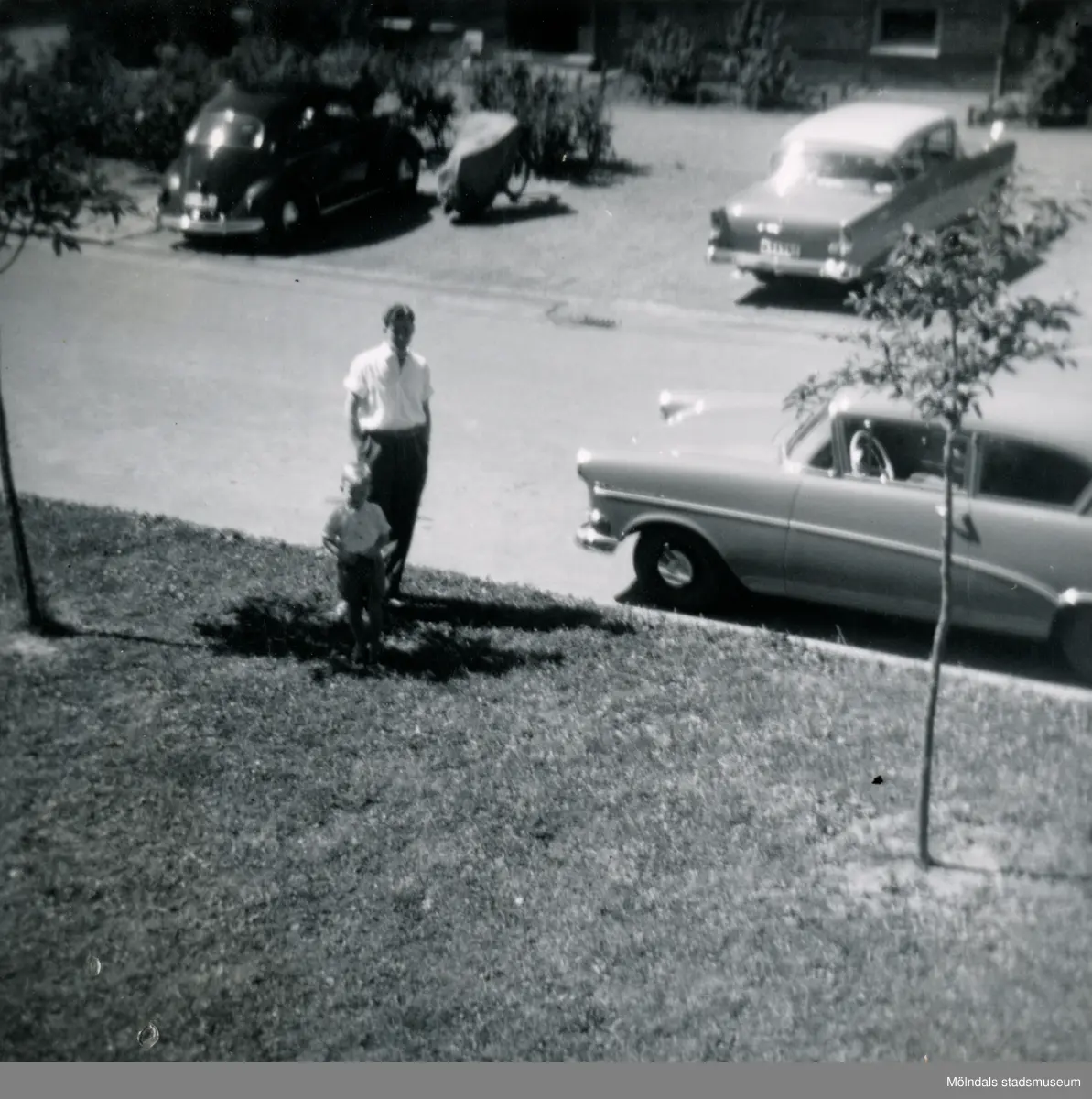Pojken Lennart Berndtsson och hans farbror Gösta Kihlqvist står intill en parkerad bil vid sidan av Tolsegårdsgatan i Bosgården, Mölndal, cirka 1958.