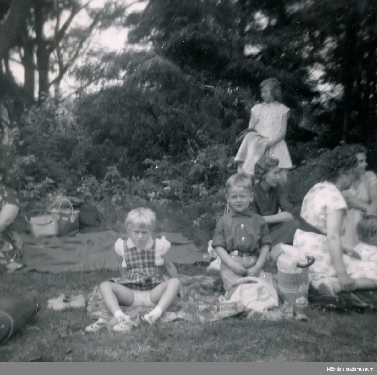 Utflykt till Balltorp i Mölndal, cirka 1958. Porträtt av pojken Lennart Berndtsson och flickan Ulla Nilsson. De var grannar på Tolsegårdsgatan 4B i Bosgården, Mölndal. I bakgrunden en samling kvinnor.