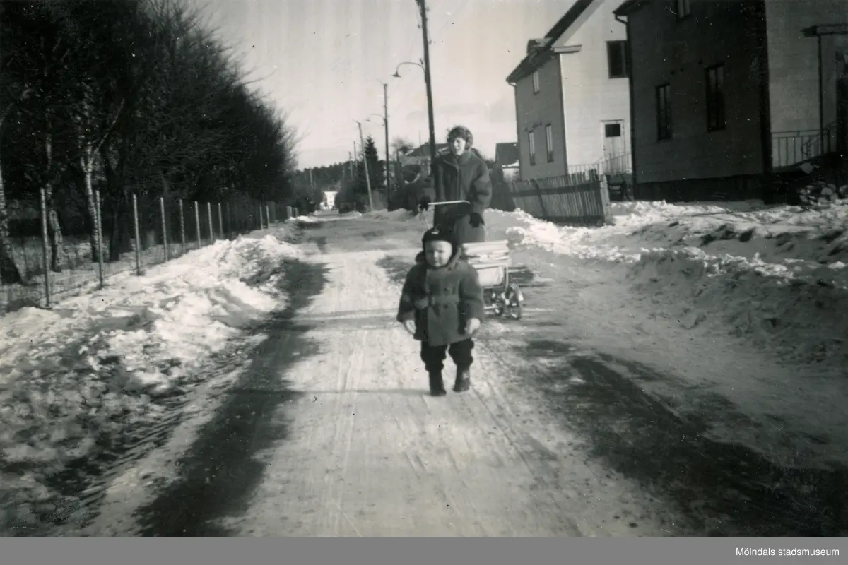 Pojken Lennart Berndtsson och hans mor Inga Maj Berndtsson promenerar på en gata. Kvinnan framför en sulky. Bostadsbebyggelse på högra sidan av gatan. Solhemsgatan på Solängen i Mölndal, cirka 1956.