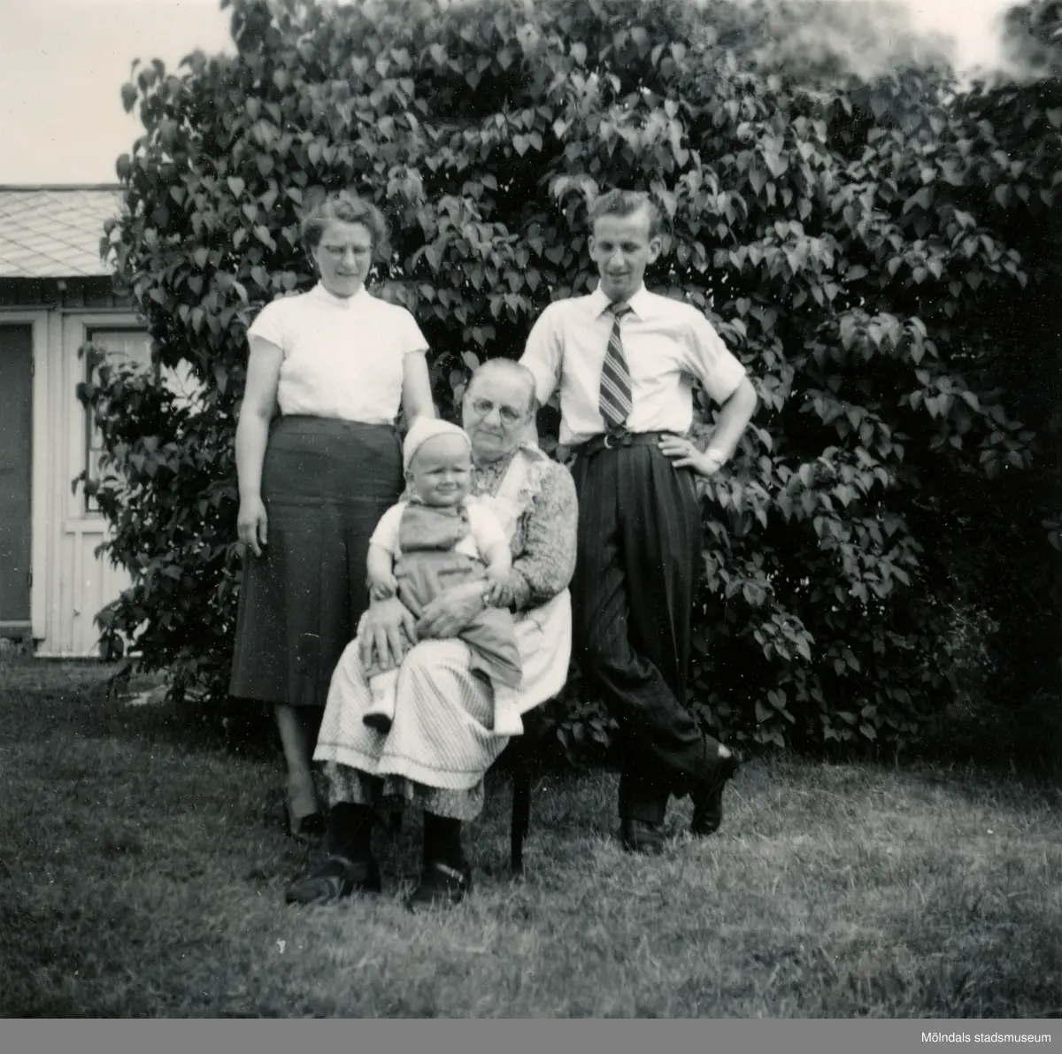 Porträtt av pojken Lennart Berndtsson som sitter i gammelfarmor Alma Berndtssons knä. Bredvid står farmor Hildur Berndtsson och pappa Leif Berndtsson. De fyra befinner sig i en trädgård i Lödöse, sommaren 1956.