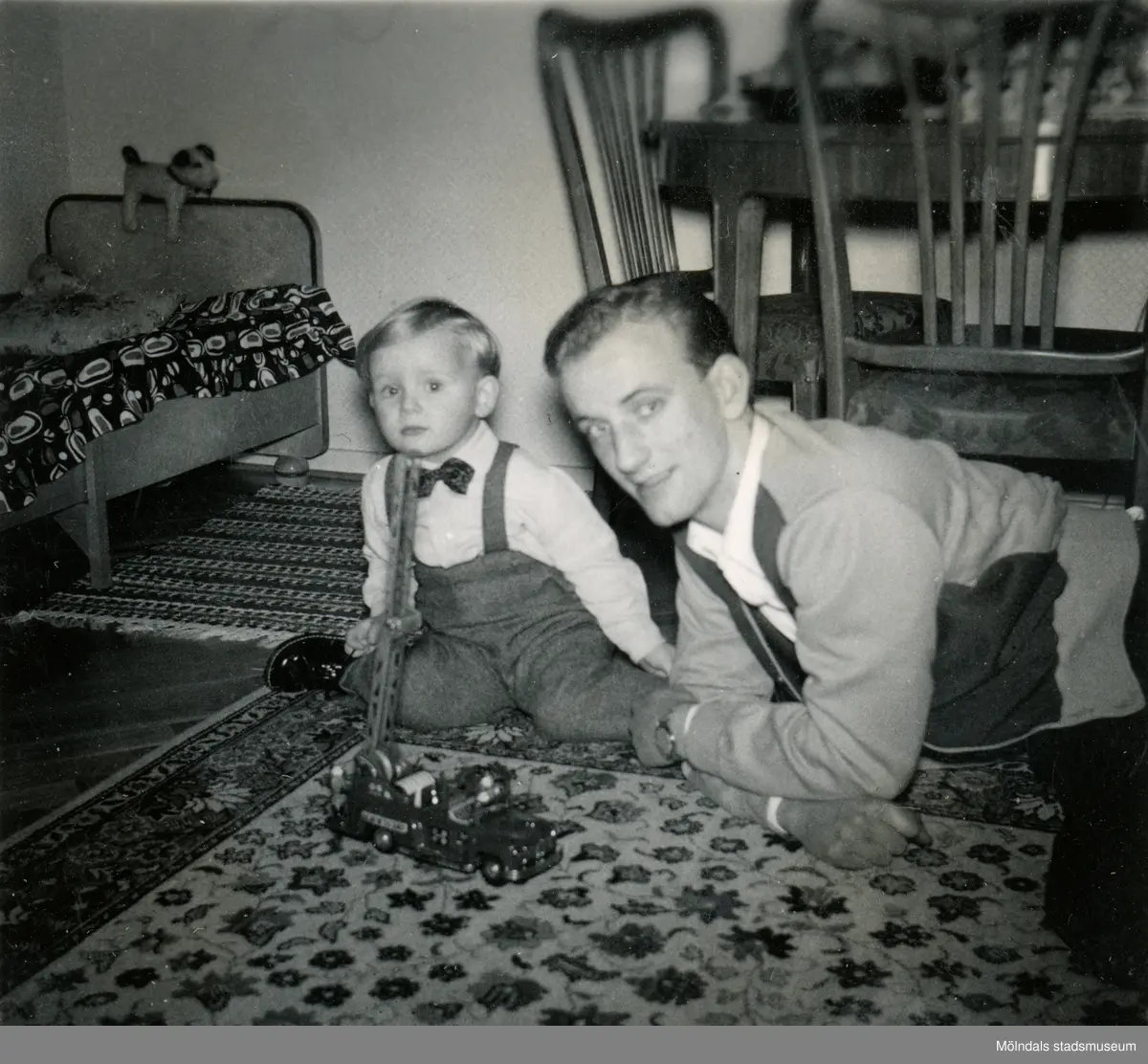 Jul på Prytzgatan 38 i Broslätt, Mölndal, cirka 1957. Pojken Lennart Berndtsson leker med en leksaksstegbil på golvet i vardagsrummet tillsammans med sin far Leif Berndtsson.