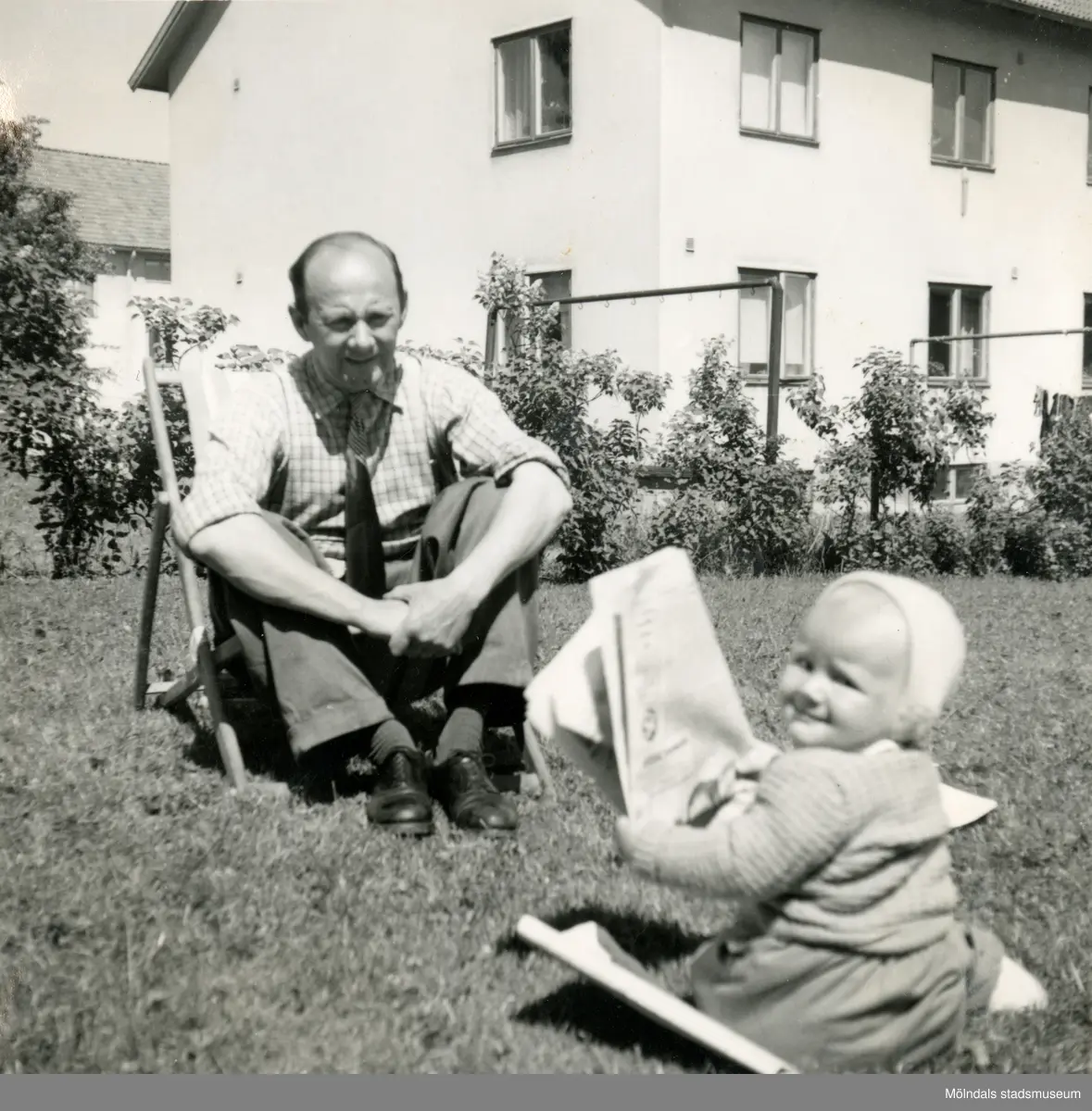 Pojken Lennart Berndtsson sitter i gräset mellan husen i ett bostadsområde tillsammans med sin farfar Bertil "Buss-Bertil" Berndtsson. Prytzgatan i Broslätt, Mölndal, år 1954.