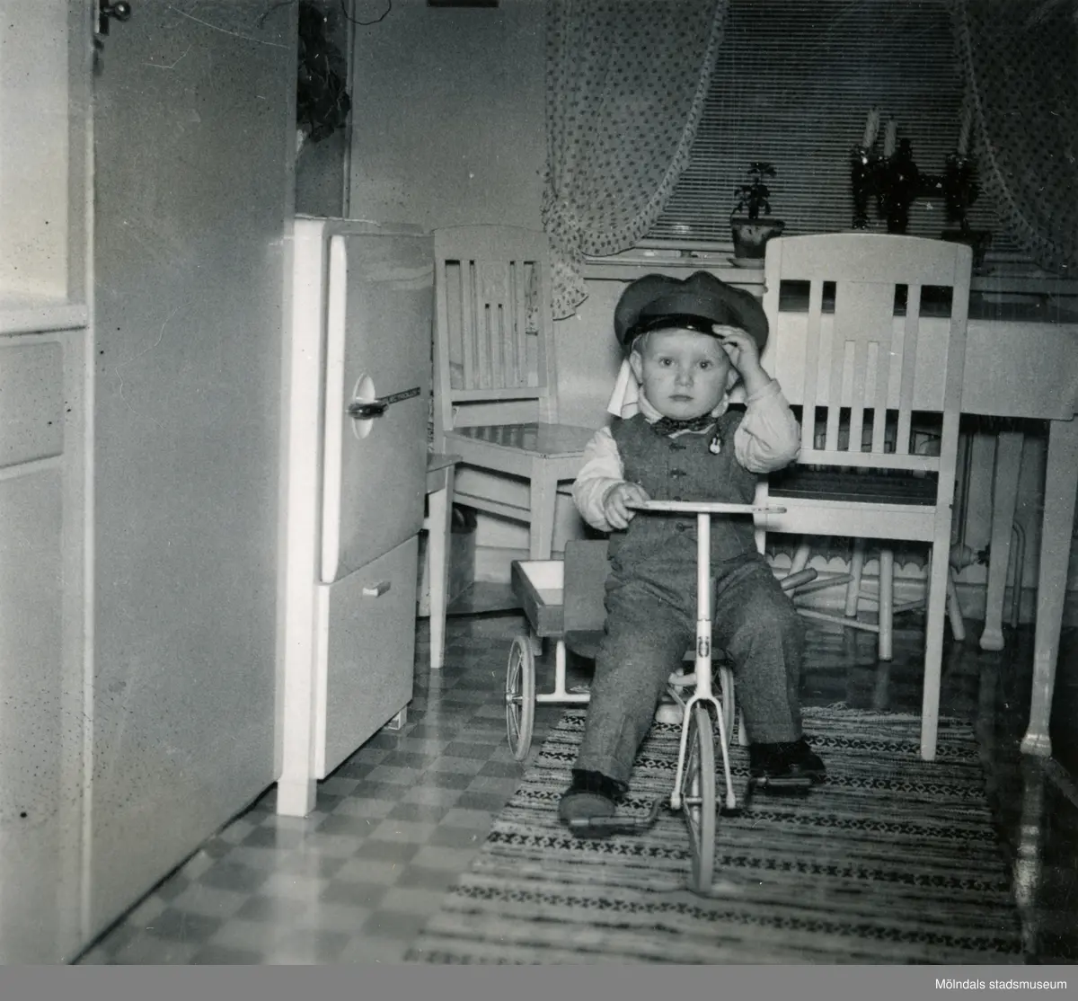Porträtt av Lennart Berndtsson som sitter på sin trehjuling med flak i köket på Prytzgatan i Broslätt, Mölndal, julen 1957. Han är klädd i en uniform som farmor sytt samt en busschaufförsmössa. Cykeln har han fått i julklapp.