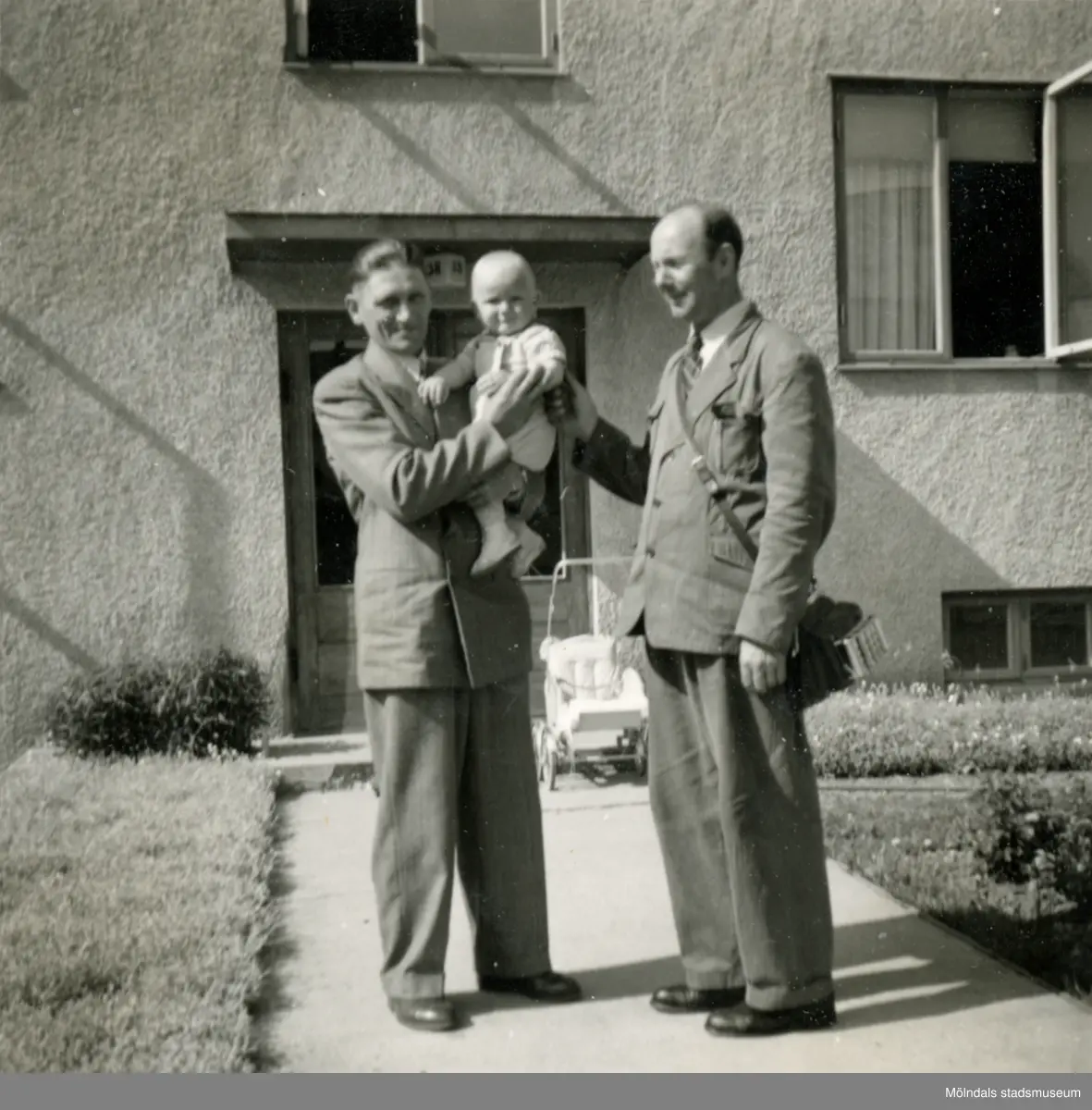 Porträtt av pojken Lennart Berndtsson i famnen på sin morfar Thure Johansson. Farfar Bertil Berndtsson står bredvid. Prytzgatan i Broslätt, Mölndal, cirka 1954.