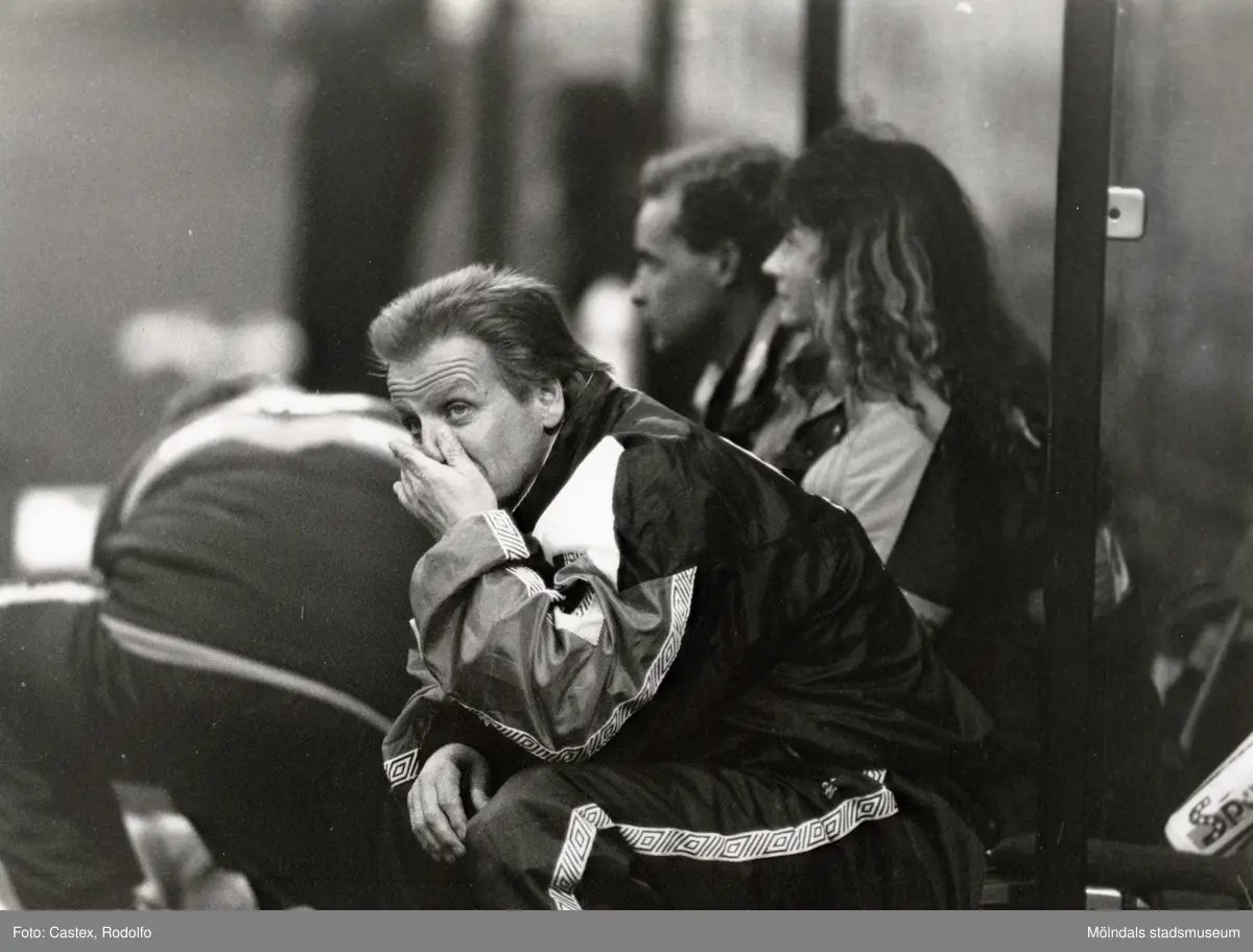 Fotbollslaget Jitex BK spelar match i Mölndal på 1990-talet. Arena, motståndarlag och slutresultat är okända. Ledare som följer matchen.