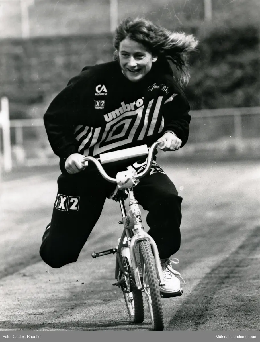 En Jitex BK-spelare som cyklar på en alldeles för liten cykel vid Kvarnbyvallen i Mölndal på 1990-talet.
